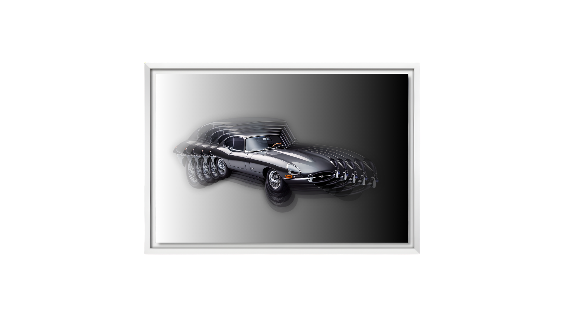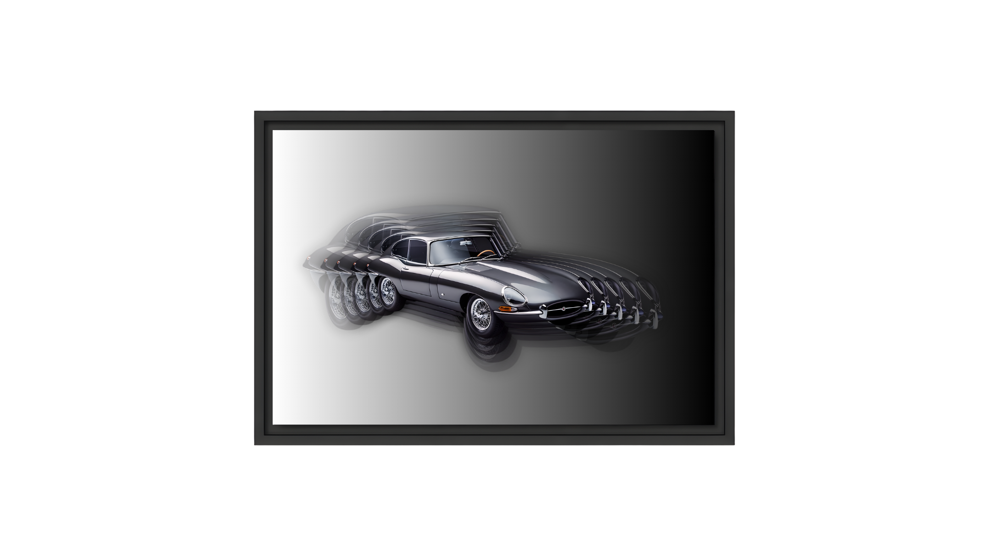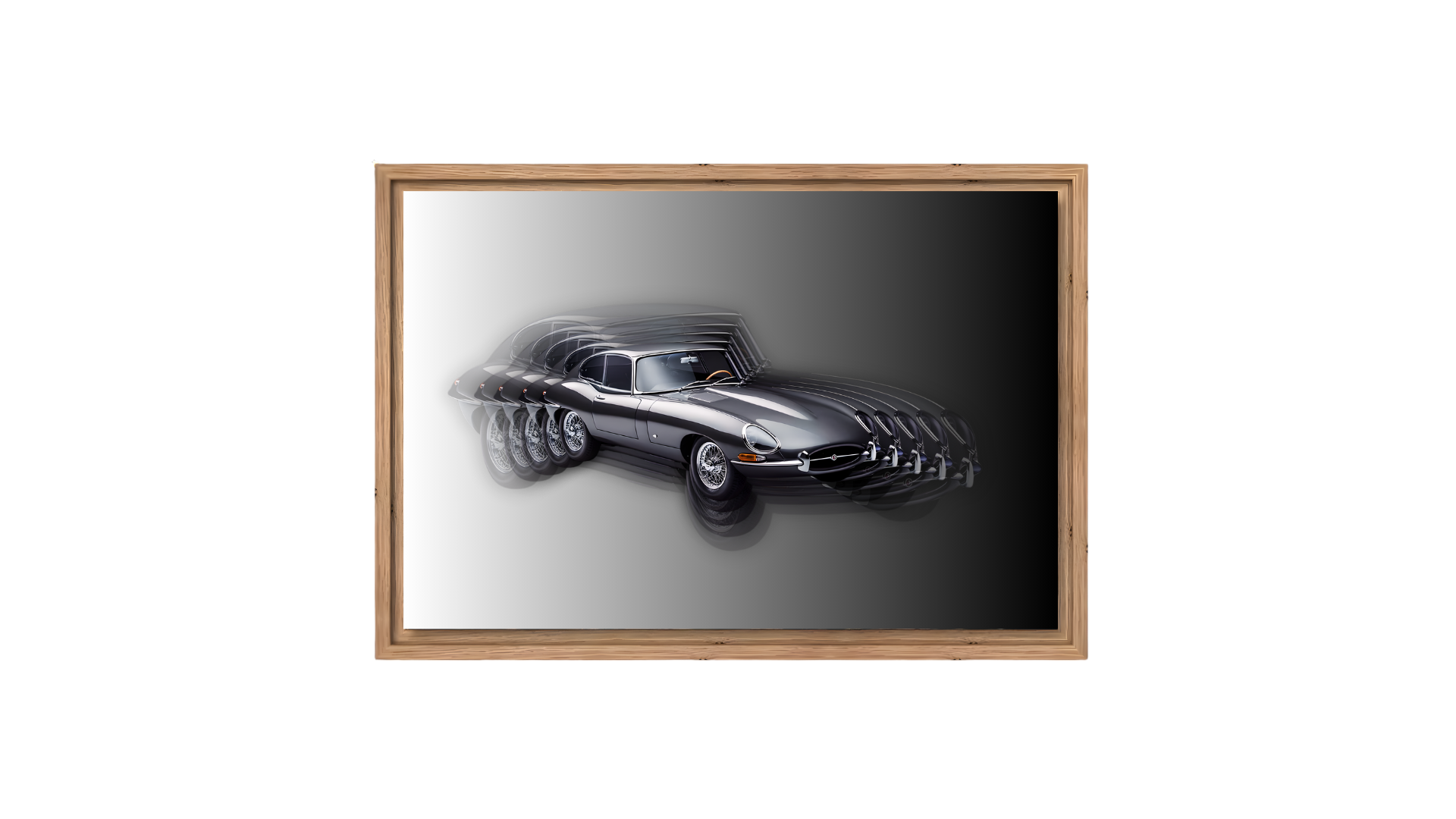 Sublimée dans un cadre en bois noir, cette œuvre met en valeur l’essence même de la Type E : élégante, sensuelle et indémodable. Une pièce murale qui capture l’âme de ce chef-d’œuvre signé Jaguar.