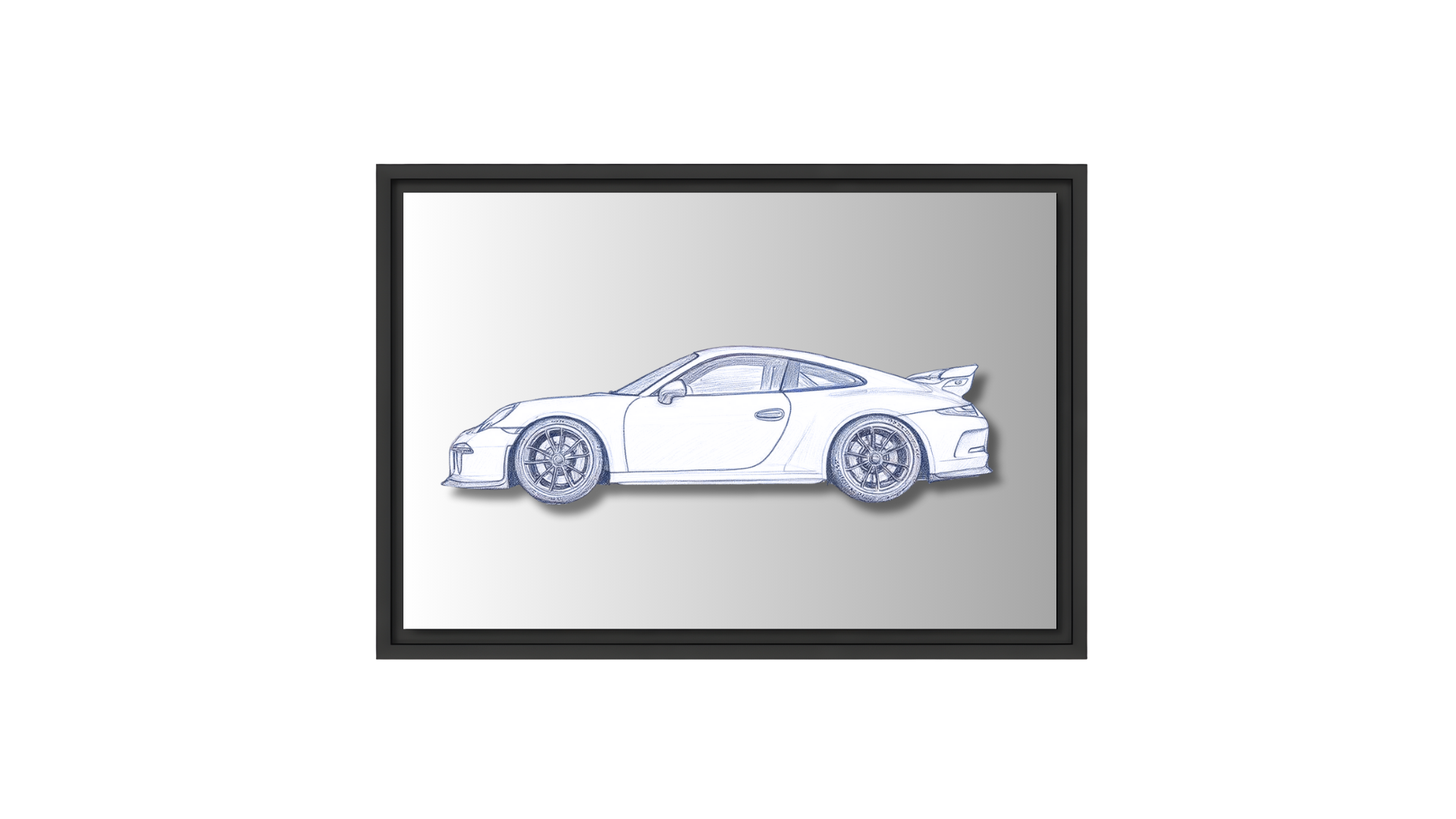 Sur un fond subtil, allant d’un gris très clair vers un blanc pur, la silhouette emblématique de la GT3 se dessine avec précision. Les traits fins soulignent ses proportions mythiques : ailes élargies, boucliers sculptés, ligne de toit iconique et aileron signature.