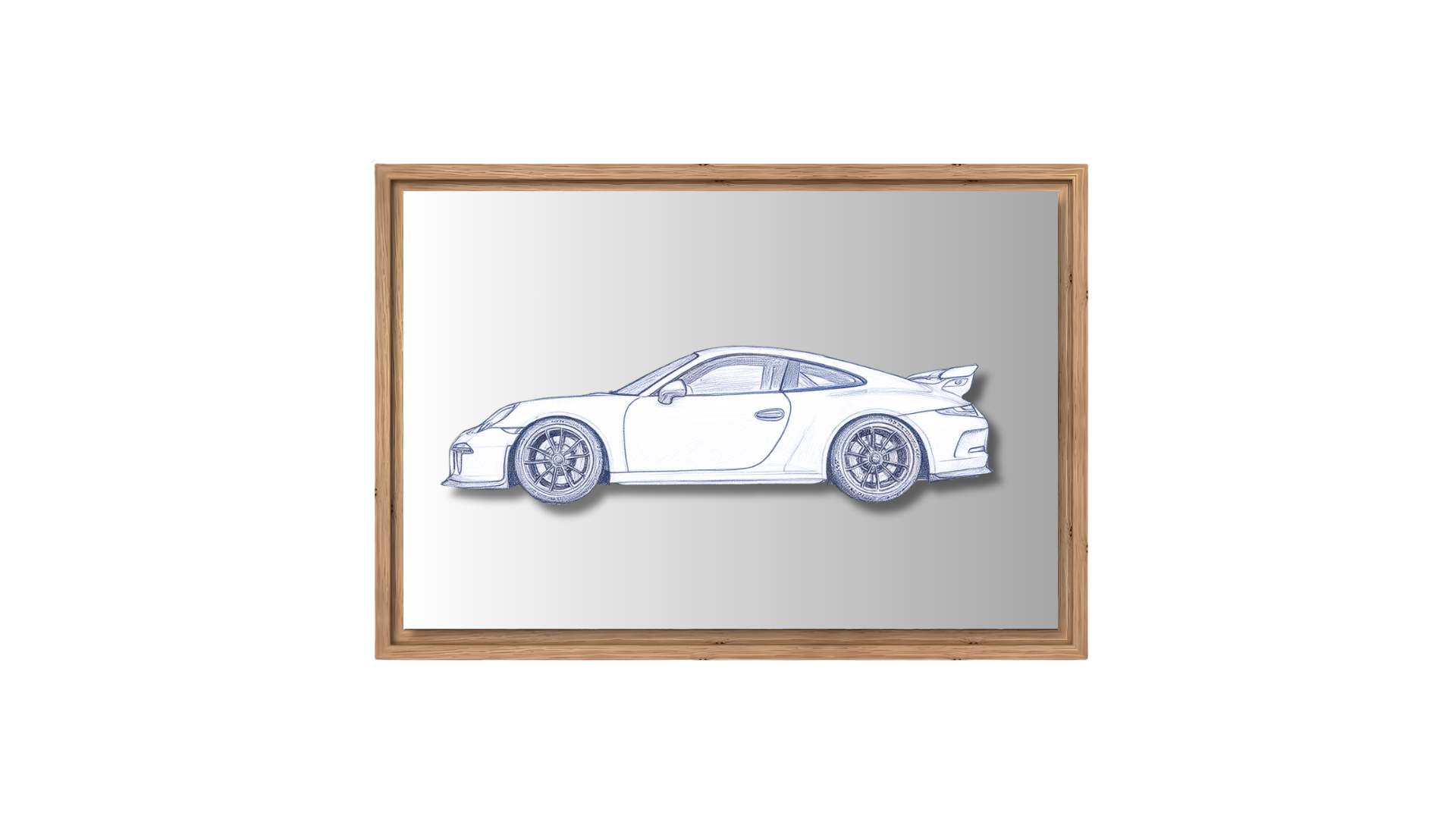 Présentée dans un cadre en bois, cette œuvre met en lumière l’essence même de la GT3 : la pureté du geste, la précision du trait, et l’âme d’une Porsche faite pour ressentir la route.